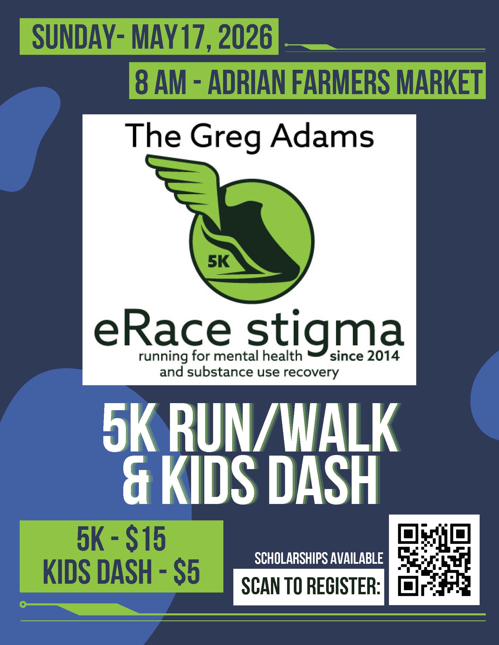 Upcoming Events Greg Adams eRace Stigma 5K Run Walk – Sunday, May 17th at 8am at the Adrian Farmers Market Register now!